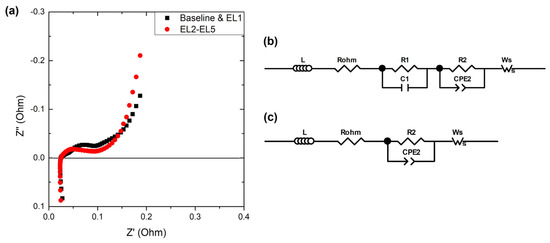 (a) Examples of Nyquist diagrams obtained by the end of life of the cells with Baseline and EL1 electrolytes (black squares) and EL2-EL5 electrolytes (red dots). Equivalent circuits used to fit the spectra with (b) Baseline and EL1 electrolytes, and (c) EL2-EL5 electrolytes.