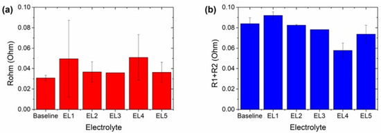 The highest frequency of both types of spectra appears in the positive quadrant of Z″ and is ascribed to the inductive effect of the wires and contact of the measurement system. It was fitted using an inductor (L) in the equivalent circuits (Figure 7b,c) to fit both types of impedance spectra [54]. In addition, as already mentioned, both types of spectra showed an increase in the absolute value of Z″ at the lowest frequencies scanned. This is related to the diffusion of lithium in the electrolytes and was fitted using a short Warburg component (Ws) [55,56]. The intersection of the real impedance (R’) with the spectra is referred to as the ohmic resistance (Rohm) of the cell, and it is used to track the stability of the cell, with the electrolyte as its most significant contributor [57,58,59]. Regarding the intermediate frequencies, at least two semicircles are usually differentiated, as observed in the spectra with Baseline and EL1 electrolytes [60]. The semicircle at higher frequencies is usually ascribed to interfacial resistances, with the SEI and the cathode–electrolyte interphase (CEI) as its most significant contributors. They were fitted with a resistance (R1) in parallel with a capacitor (C1) (Figure 7b). It is followed (and partially overlapped) by a depressed semicircle, which is related to the charge transfer resistance. This was fitted with a resistance (R2) in parallel with a constant phase element (CPE2). The latter is an “imperfect” capacitor, visible as a depressed semicircle in the Nyquist diagram. The porosity of the electrodes is one of the most significant parameters causing this “imperfection” [54,61]. The spectra with electrolytes EL2-EL5 could not be fitted with the equivalent circuit in Figure 7b with error values below 10% and the equivalent circuit had to be adapted. For these electrolytes, a single resistance (R1 + 2) in parallel with a constant phase element (CPE1 + 2) was used. The cause for this difference remains unclear but might be due to the electrolyte used. It is likely that R1-C1 and R2-CPE2 were present in the semicircle of the electrolytes EL2-EL5 but could not be deconvoluted. Based on the information provided by the electrolyte manufacturer (Table 2), it could be expected that the linear carbonates and their concentrations were different for the electrolytes EL2-EL5. This could lead to a different SEI composition [62], which would affect the response to the impedance spectroscopy analysis. In addition, as the electrolyte EL1 was a reproduction of the Baseline electrolyte, it could be assumed that the carbonate selection and their fraction would be similar. Nevertheless, it would be necessary to know the exact formulation of the electrolyte to validate this hypothesis. In any case, as already mentioned, the experiment was less clarifying than expected, but we believed that could be positive to include it as in most cases, the electrolyte formulation is not disclosed in commercial LIB. To compare the results with the different electrolytes, the sum of R1 and R2 was used for Baseline and EL1 electrolytes. The resistance values obtained for the cells with each electrolyte are compared in Figure 8.