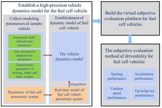 In response to the demand for the evaluation of fuel cell vehicle driveability, this paper proposes a method for modeling and subjective evaluation of fuel cell vehicle driveability. As shown in Figure 1, the main research methods of this paper are as follows: the parameters of the fuel cell vehicle prototype, including suspension, tires, steering, brake, the fuel cell vehicle powertrain system and other characteristic parameters, are utilized to complete the modeling of the vehicle dynamics and fuel cell powertrain system and achieve the integration of the fuel cell powertrain system and the vehicle dynamics model. Next, the integration of the fuel cell vehicle model and the automobile driving simulator are realized and a subjective evaluation platform of driveability for fuel cell vehicles based on the automobile driving simulator is formed. Finally, the differences between fuel cell vehicles and traditional fuel vehicles in terms of powertrain systems is fully considered, and the evaluation method suitable for the driveability of fuel cell vehicles is proposed. Evaluators are proposed to score the starting performance, acceleration performance, uniform speed performance, and tip-in/tip-out performance of the fuel cell vehicle and obtain corresponding subjective evaluation results.