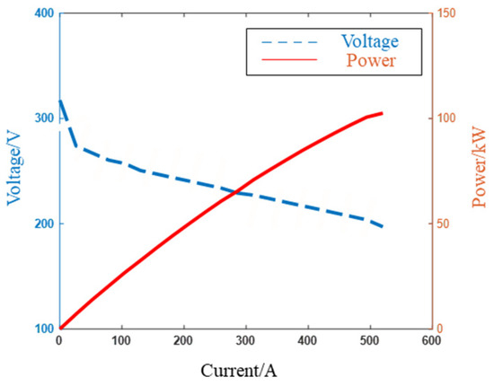 The schematic diagram of the structure of proton exchange membrane fuel cells is shown in Figure 2. The reaction of fuel cells can be seen as two semi-electrochemical reactions, namely the oxidation reaction of hydrogen at the anode and the reduction reaction of oxygen at the cathode. In this paper, the model of the proton exchange membrane fuel cell (PEMFC) is established. The polarization curve of PEMFC reflects the relationship between steady voltage and current density or current of the fuel cell. The polarization curve of the fuel cell is shown in Figure 3.