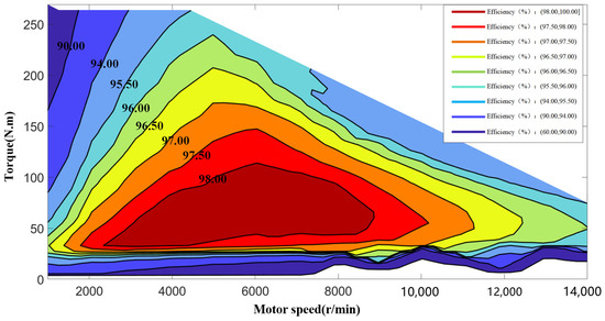 The drive motor converts electrical energy and mechanical energy when the fuel cell vehicle is in the starting, accelerating, braking and other conditions. In the process of energy conversion, there will be a certain loss of motor power. As shown in Figure 6, the drive motor model established in this paper uses the motor working efficiency map to determine the working efficiency of the drive motor, which reflects the motor energy conversion efficiency under different motor angular velocities and torques. The range of energy conversion efficiency that may occur during the operation of the drive motor is 85–98%.