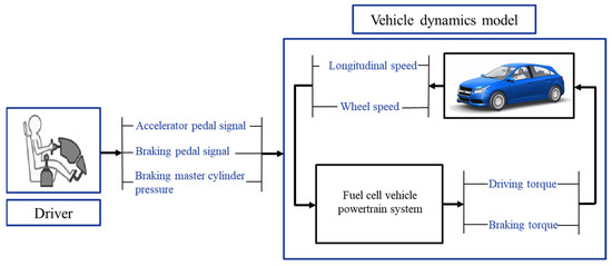 The integration relationship between the fuel cell vehicle powertrain system and the vehicle dynamics model is shown in Figure 9. The fuel cell vehicle powertrain system obtains the accelerator pedal signal, braking pedal signal and master cylinder pressure from the driver, and the wheel speed and longitudinal speed signals are obtained from the vehicle dynamics model. It uses the above signals to calculate the torque and transfer it to the vehicle dynamics model to solve the vehicle motion.