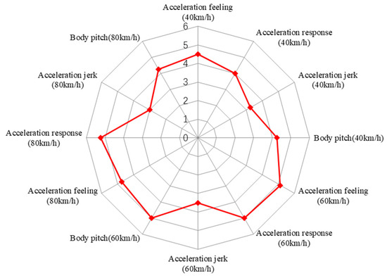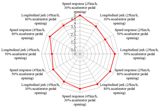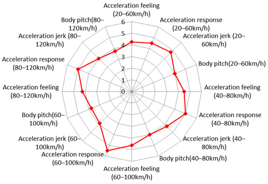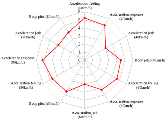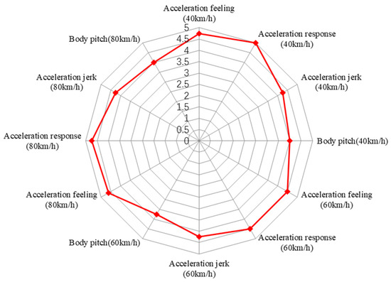 The subjective evaluation results of accelerating to 100 km/h at full accelerator pedal pressing are shown in Figure 12. The scores of the acceleration response, acceleration jerk and body pitch are all 5–6 points, indicating that the acceleration performance is good. However, the score of acceleration feeling is 3 points, which indicates that the acceleration felt by the driver is small.