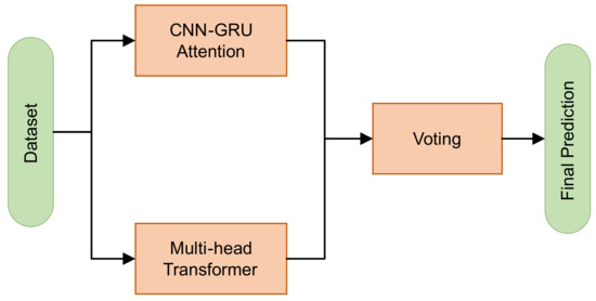 Figure 1, is a sophisticated ensemble learning approach that combines the predictive outputs of multiple base models, thereby aiming to enhance the overall predictive accuracy. In this context, it integrates the results of the Multi-Head Attention model and the hybrid CNN-GRU with attention model using a soft voting mechanism.
