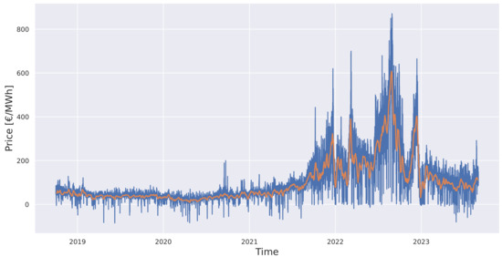 More specifically, it can be observed that until November 2021, both the price and the average price exhibited stability, without extreme values. From November onward, a significant increase was observed in both time series, with the average hourly price reaching 600 €/MWh and the corresponding mean price reaching 40 €/MWh. Subsequently, from the beginning of 2023 onward, the price variation appeared to stabilize, and extreme values were eliminated. These extreme fluctuations create imbalances in the electricity market, thus making price prediction in wholesale trading an exceptionally challenging process. Political–economic factors caused imbalances in wholesaler transactions, thus resulting in the market losing its stability with respect to price fluctuations. Therefore, it becomes evident that the accurate prediction of the hourly price is a difficult task, but it is simultaneously a significant challenge for deep learning models.