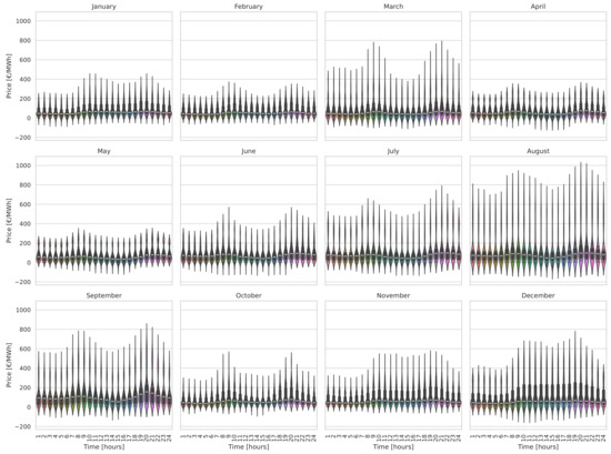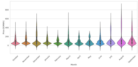 Figure 5 presents the violin plot of the average monthly price variation, thereby taking into account all the years from 2018 to 2023. We observe that all months showed negative electricity prices. While August and September had the highest prices compared to the other months, January, February, April, May, October, and November showed peaks, which represent high frequency and probability to exhibit values nearly the median.