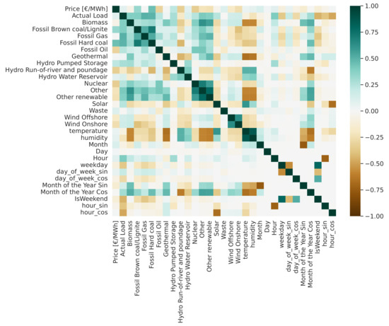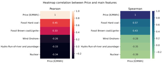 The first reasonable conclusion drawn is that conventional energy sources exhibited a positive correlation, both in Pearson and Spearman analyses. Furthermore, renewable energy sources (RESs) showed negative correlations with price fluctuations. Remarkably, the variable ‘Hydro Run of River and Poundage’, despite accounting for only 14% of the average production compared to ‘Fossil Brown coal/Lignite’, demonstrated scientifically acceptable correlations of −0.33 and −0.35 with the price, respectively, thereby underscoring its consideration in price forecasting.