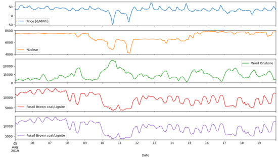 Figure 16, it is observed that for the longest period of observations, the price, as well as the variable ‘Fossil Brown coal/Lignite’, had the highest effect on price prediction. More specifically, the price achieved a score of −0.52, the ‘Fossil Brown coal/Lignite’ achieved a score of 0.55, the ‘Fossil Hard coal’ achieved a score of 0.3, the ‘Wind onshore’ achieved a score of −0.73, and the variable ‘Hydro Run-of-river and poundage’ achieved a score of −0.55.