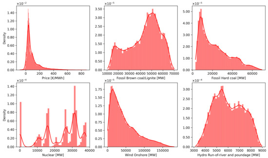 Figure 12 illustrates the graphical representation of the distribution of the six input variables. Specifically, it is noteworthy that the time series of “Fossil Hard Coal” and “Wind Onshore” exhibited a uniform distribution, which a pattern that was also observed between the variables “Hydro Run-of-river and poundage” and “Fossil Brown coal/Lignite”. Notably, the distribution of “Nuclear” presented an intriguing pattern, thereby containing fluctuations and not adhering to a specific distribution approach, unlike the other forms of energy.