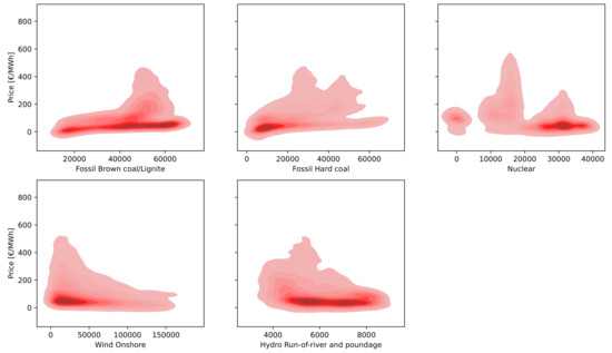 Figure 13, it is observed that the features “Fossil Brown coal/Lignite” and “Hydro Run-of-river and poundage” exhibited a smooth correlation with the price of electrical energy, a fact which is proved by the intense color that extends almost across their entire value range. Additionally, concerning the variables “Fossil Hard coal” and “Wind onshore”, a similar smoothness of prices was noted with a narrower range of price density concentration. Finally, regarding nuclear energy production, it is noted that the variable “Nuclear” demonstrated a higher density at higher values, which is a particularly interesting fact indicating its significant influence on shaping prices at higher nuclear energy production values.