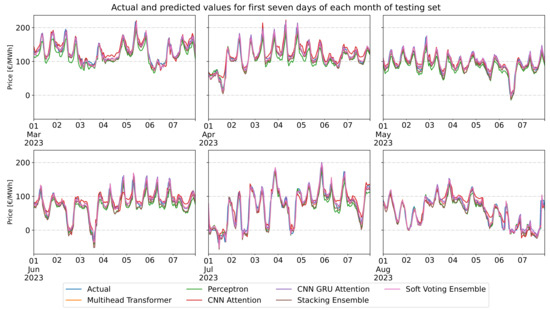 Figure 14 illustrates the plot diagram of the actual and predicted values for the first seven days of each month in the testing period. From the plots most of the models present exceptional predictability except for the base model and CNN with attention model, as described above. Additionally, in