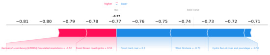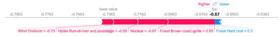 Figure 17 presents the effect of the input variables for a period in which negative electricity prices were observed. It is noteworthy that for the specific interval, the effect of the renewable energy sources was very high and presented negative values, a fact that shows a negative correlation between the RES variation and the price of electricity, as was analyzed above. Finally, it seems that the effect of conventional energy sources for these cases was quite small, with the variable ‘Fossil Hard coal’ showing a value of 0.3.