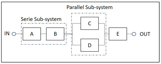 In the example of Figure 3, the RBD is made up of five components; A and B constitute a series subsystem, and C and D constitute a parallel subsystem. These two subsystems are in series with the component E.