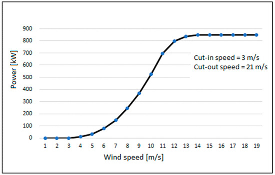 The turbine model presents a power curve with a very low cut-in speed, as reported in Figure 4. The choice of this turbine model is probably due to the low wind speed distribution of that geographical zone. Figure 5 illustrates the layout of the wind farm.