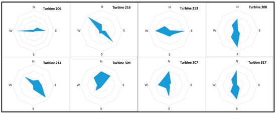The distribution of the wind directions for 8 turbines (1 per cluster) [57].