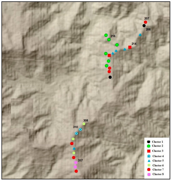 Table 4 presents the results of the cluster analysis, by having the algorithm testing from 2 up to 8 clusters. The wind farm site, due to the variability of all samplers (all variables presented a high standard deviation), showed a lower S coefficient, and only the case of 8 clusters fulfilled the criterion (S > 0.5). Figure 7 shows the clusters and Table 5 the centroid turbine of each cluster.