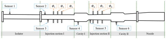 Three pairs of injectors were positioned in front of each cavity and arranged sequentially along the incoming flow direction; these were marked as Φ1, …, and Φ6, respectively. Similarly, to facilitate subsequent discussion, the fuel supply was represented by an equivalent ratio. For instance, Φ1 = 0.3 indicates that the first pair of nozzles supplies fuel at an equivalent ratio of 0.3, while in the actual experiment, the upper and lower injectors were simultaneously injected at an equivalent ratio of 0.15.