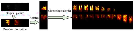 Replaceable viewing windows were used to capture flame characteristics in the combustion chamber. A high-speed camera with a specialized filter records the CH* intensity at a sampling rate of 10,000 frames per second. Photographic results of injection II and cavity II are presented in Figure 2 after undergoing image processing. Grayscale images acquired with the filter were colorized frame by frame using a pseudo-color algorithm. The colorized images were rotated and arranged in chronological order to aid in further discussion.