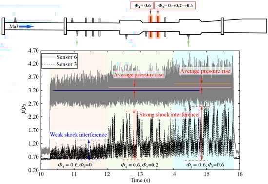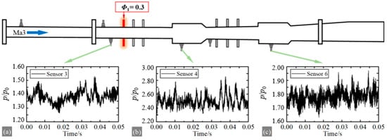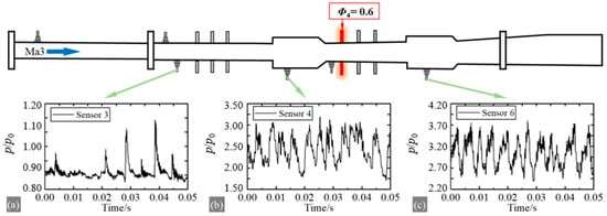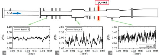 The pressure results from sensors 3, 4, and 6 at Φ6 = 0.6 are displayed in Figure 6. Sensor 3 did not experience surge interference. The average pressure values for sensors 4 and 6 were 1.9 and 2.9, respectively, with an amplitude of approximately 22%. The backward injection position leads to the backward development of the shock front. Figure 5a and Figure 6a show weaker shock intensity with backward injection. Figure 5c and Figure 6c indicate lower cavity pressure with backward injection. These observations suggest the incomplete burning of fuel in cavity II with Φ6. A low cavity pressure implies reduced shock back pressure, weakening the shock and boundary layer separation. This condition may trigger a high-energy instability process without inlet unstart across various fuel flow variations.