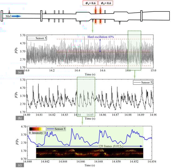 Comparison with data from other pressure sensors revealed that the most significant oscillation took place at sensor 5, exhibiting an average pressure of approximately 350 kPa and an amplitude of around 43%, as depicted in Figure 8a. The most intense oscillation took place upstream of the combustion zone instead of in cavity II, suggesting that the oscillation was influenced not only by heat release instability, but also by additional mechanisms that supply the energy input. For a more detailed analysis, the time interval between 14.8 s and 14.9 s was chosen, as illustrated in Figure 8b. The intense oscillation displayed distinct peaks, occurring at a frequency of approximately 300 Hz. This frequency is relatively close to the reports of Allison [18], Tian [19], and Zhong et al. [20]. Moreover, the pressure curve within a timeframe of 0.012 s was selected and aligned with the starting point in time, as depicted in Figure 8c.