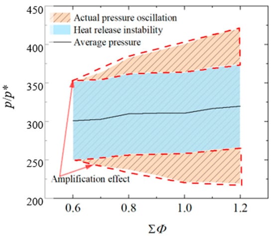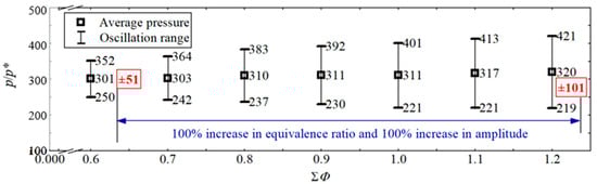 Figure 9 illustrates that both the average value and amplitude of pressure oscillations at sensor 6 increased as the equivalence ratios increased, although the magnitude of the increase varied. Here p* is the reference pressure, determined by the local atmospheric pressure. To further elucidate this issue, four additional experiments were conducted to statistically analyze the relationship between the pressure oscillations and the global equivalence ratio. These experiments were performed under various operating conditions, namely Φ4 = 0.6/Φ5 = 0.1, Φ4 = 0.6/Φ5 = 0.3, Φ4 = 0.6/Φ5 = 0.4, and Φ4 = 0.6/Φ5 = 0.5, as depicted in Figure 9. The amplitude was 51 at an equivalence ratio of 0.6, but 101 at an equivalence ratio of 1.2. With a 100% increase in the equivalence ratio, the average pressure rose by 6.33%, and the amplitude also experienced an approximately 100% increase.