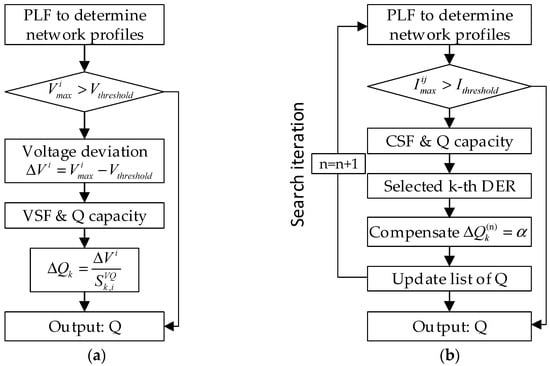 Var Precedence and Watt Precedence utilize the relatively high sensitivities of Q–V and P–I sensitivity factors and decouple active power control (for current control) and reactive power control (for voltage control). Var Precedence prioritizes reactive power control first and then performs active power control, while Watt Precedence prioritizes active power control and performs reactive power control subsequently, which is designed as a two-step control process. If the first round of the two-step control cannot reach the accurate control commands of DERs, both methods can use iterative calculation by going back to the first step to obtain a more relevant solution.