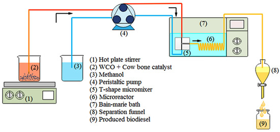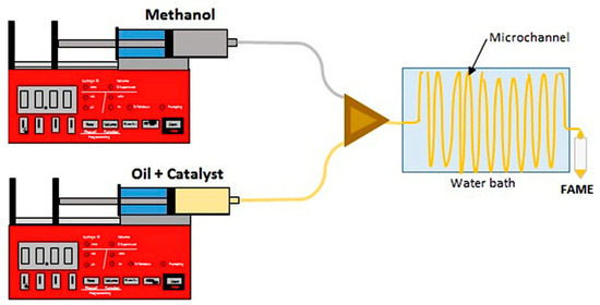 Mohadesi et al. [36] reported a 99.24% biodiesel conversion from waste cooking oil in a stainless steel microchannel reactor in the presence of a heterogeneous base catalyst. The reactor had an internal diameter of 0.8 mm and a volume capacity of about 1 cm3. Reactants were fed into the reactor via a T-mixer using a peristaltic pump, and a reaction temperature of 63.1 °C was maintained via a bain-marie bath, as shown in Figure 3. Since the utilisation of heterogeneous catalysts generally requires long reaction times, the microchannel reactor was successful in containing the reaction time within 60 s at optimised conditions.