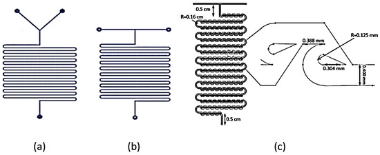 Yusuf et al. [34] reported the study of a novel Tesla-shaped microchannel reactor for the production of biodiesel. Three different shapes of microchannel reactor designs were comparatively investigated, namely the Y-shaped, T-shaped and the novel Tesla-shaped microchannel reactor, as observed in Figure 6. Four permutations of the T-shaped microchannel reactor were initially fabricated to determine optimum microchannel dimensions, following which, one Y-shaped microchannel reactor and the Tesla-shaped microchannel reactor were fabricated. The width and depth of all microchannel reactor designs were 400 μm × 400 μm. However, the number of bends, length and volume of the best-performing T-shaped and Y-shaped microchannel reactors were 10 bends, 41 cm and 0.06456 mL, respectively. On the other hand, the Tesla-shaped microchannel reactor had a total of eight bends with a length of 33 cm and a volume of 0.0970 mL.