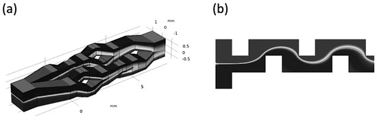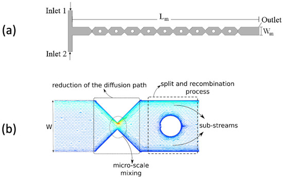 (a) Chaotic micromixer design; (b) double symmetrical V-shaped baffle configuration (adapted from [44]).