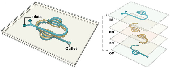 Zhu et al. [58] reported the study of a lamination-based SAR passive micromixer with a Y-shaped inlet as observed in Figure 9. The Y-shaped inlet receives two different reactants in separate flows and combines them into a single flow. The reactor comprises an input module (IM) layer on the top, multilayered microchannel layers called enhancement modules (Ems) in the middle and an output module (OM) on the bottom. The EM layer that features stackable modules is intended to improve the mixing of reactants while maintaining a compact reactor design. Additionally, the EM module is an excellent method to enhance mixing by enabling better molecular diffusion of reactants due to the multiple stackable layers.