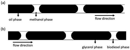 Slug flow scheme of (a) reactants and (b) products in a microchannel for biodiesel production (adapted from [77]).