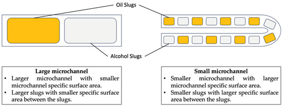 Sun et al. [77] reported an investigation on slug flow pattern for biodiesel production from cotton seed oil with a 6:1 methanol-to-oil molar ratio, 1% potassium hydroxide catalyst loading and reaction time of 6 min. The study was carried out in a stainless-steel microchannel reactor with a diameter and length of 0.25 mm and 30 m, respectively. Figure 12 illustrates the scheme of (a) reactants and (b) products in the slug flow. The immiscibility of oil, alcohol, biodiesel and glycerol that was caused by high interfacial forces between the fluids resulted in the formation of alternating slugs in the microchannel. Biodiesel yield increased from 96.2% to 99.4% with the increase in reaction temperature from 30 °C to 60 °C with a slug flow pattern. However, further increasing the reaction temperature to 70 °C resulted in a slight drop in yield to 99.1%, with a change in flow pattern from slug to bubble flow due to the boiling of methanol. Furthermore, the specific surface area of microchannels was 2000 m2m−3, 7547 m2m−3 and 16,000 m2m−3 with diameters of 2.0 mm, 0.53 mm and 0.25 mm, respectively. As illustrated in Figure 13, a larger microchannel specific surface area is a result of smaller microchannels, simultaneously creating smaller slugs. Moreover, smaller slugs result in a larger specific surface area between the slugs. The large specific surface area of both microchannels and slugs enhances heat and mass transfer between oil and alcohol, hence contributing to high biodiesel yield.