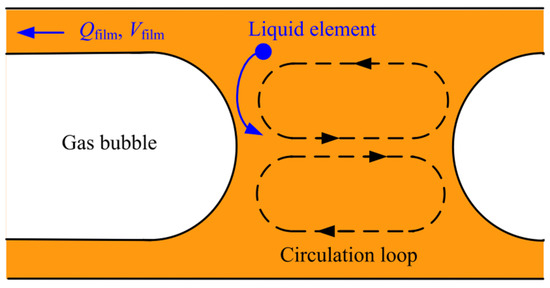 The flows inside microchannel reactors follow various patterns. Common internal flow patterns in microchannel reactors are bubble flow, slug flow, churn flow and annular flow as observed in Figure 14. Other flow patterns include stratified flow and droplet flow. Comparatively, slug flow is known to be a complex flow pattern that has unstable flow properties [79]. Slug flow has a two-phase flow pattern of gas slug and liquid slug in an alternating order [80]. Usually, the gas slug comprises a gas bubble, which is surrounded by the liquid film, as illustrated in Figure 15. The gas slug may also appear as two bubbles that separate a liquid slug. Since gas is lighter than liquid, a thin liquid film would exist between the microchannel wall and the gas slug [73]. The wettability of the channel wall and the liquid determines the degree of liquid film formation [72].
