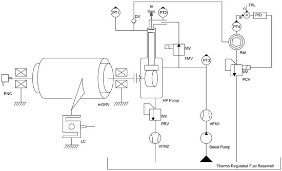 Figure 2 illustrates the mechanical–hydraulic configuration of the system. Pump shaft speed is imposed, regardless of the rail pressure conditions, by the electric drive (e-DRV). In the rail tube (Rail), pressure regulation is based on PID control of the pressure control valve (PCV). The boost pump supplies the high-pressure pump. The pressure relief valve (PRV), situated in the HP pump body, governs the fuel pressure upstream of the flow control valve (FMV). The tested fuel is delivered by a parallel-flow fluid handling system that provides thermal regulation and filtration within the reservoir. Flow rates are measured through volumetric flow meters on pump inlet line (VFM1) and on pump return line (VFM2). A rotary encoder (ENC) is used to measure the speed and the angular position of the pump shaft. The pressure transducers detect the piston working chamber pressure (PT1), the inlet pressure (PT2), the boost pressure (PT3), and the rail pressure (PT4).