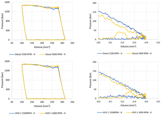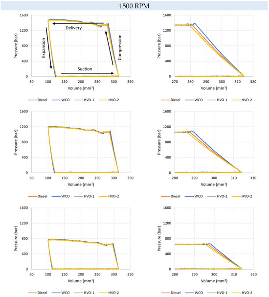 Figure 4 presents diagrams of the pump internal pressure at 1500 RPM. The internal pressure is plotted against the piston working chamber volume for the three pressure levels (L, M, and H) and the four considered fuels. The results are organized in the figure by displaying the complete pump operation cycles in the left column, while cycle details or subphases are shown on the right. Pressure–volume (p-V) diagrams highlight the pump behavior throughout its operating cycle, depending on the fuel. Each fuel type and pressure level produces its own distinctive curve, reflecting how the pump’s internal pressure varies with changes in the piston working chamber volume. The left column in figure shows the complete cycle diagrams. The right column provides more detailed information about the late suction phase and the compression (or early compression) phase, helping to highlight key events or transitions.