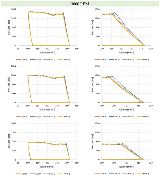 Figure 5 shows the working diagrams of the pump at 3000 RPM. The impact of fluids on the pump behavior resembles that observed at 1500 RPM, with the diagrams of the two HVO fuels superimposed, and the diesel diagram positioned between HVO and WCO. However, it is noteworthy that at 3000 RPM, the pump exhibits some irregularities towards the end of the intake phase. Upon closer inspection of the end of the suction phase (Figure 6), significant deviations in pressure trends are observed compared to the set admission pressure of 4 bar. The pressure peaks highlighted in Figure 6 (right) occur during the final stages of intake, when the volume of the working chamber is still increasing. In such instances, it is conceivable that these pressure peaks stem from communication with the delivery environment, possibly due to the imperfect sealing of the delivery valve or its oscillation/vibrations. This phenomenon is present across all three pressure levels and never appears at low speed.