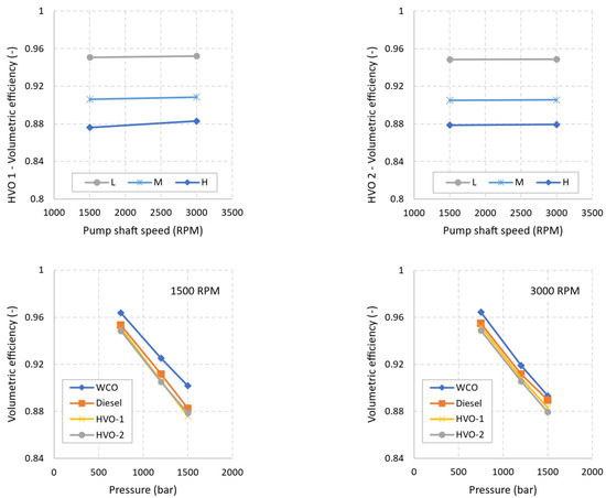 Volumetric efficiency vs. pump shaft speed (for low (L), medium (M), and high (H) pressure) and volumetric efficiency vs. pressure (for 1500 and 3000 RPM).