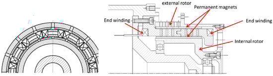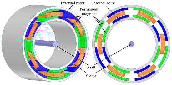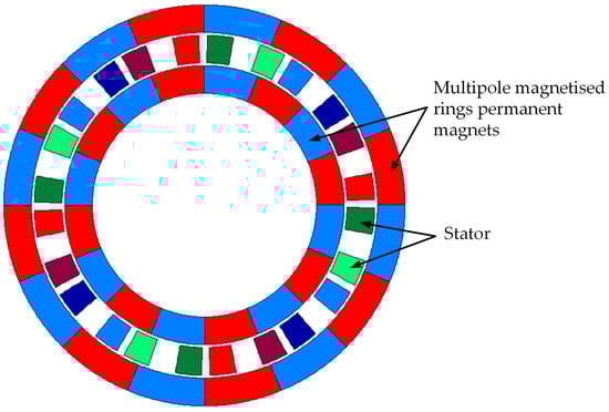 The first structure of the magnetic circuit of a permanent magnet coreless synchronous motor developed as part of this study is shown in Figure 1. The motor is assumed to be powered and controlled by a controller integrated into the motor. In the three-phase stator winding, it is possible to distinguish an arrangement of coils attached to a stationary motor body that is not visible in the figure. The rotor consists of two mechanically coupled ferromagnetic rings with sintered neodymium magnets bonded to them. The magnets on the outer and inner rings are magnetised in the radial direction.
