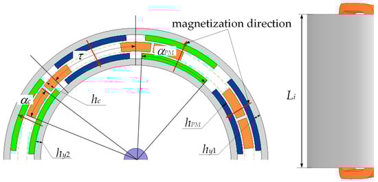 - Komeza, K.; Lefik, M.; Juszczak, E.N.; Roger, D.; Takorabet, N.; Meibody-Tabar, F. Analysis of the Impact of the Design of HT Machines on the Cogging Torque and Losses in Permanent Magnets. In Proceedings of the 2016 IEEE International Conference on Power Electronics, Drives and Energy Systems (PEDES 2016), Trivandrum, India, 14–17 December 2016; pp. 1–6. [Google Scholar]
