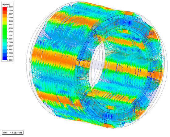 A parametric 3D numerical model of the motor was developed in the Ansys Maxwell environment. The model enables analysis of the effect of changing parameters that describe the structure of an electromagnetic circuit, such as the number of pole pairs p, the coil pitch span c, the coil height hc, the magnet pitch span PM, the magnet height hPM, the thickness and length of the motor hy1 and hy2 yokes Li of motor-on-motor performance—Figure 2. An exemplary field distribution determined using a 3D field model of electromagnetic phenomena is shown in Figure 3.