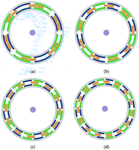 Cross-sections of coreless machines: (a) 8 poles/6 coils, (b) 12 poles/9 coils, (c) 16 poles/12 coils, (d) 20 poles/15 coils.