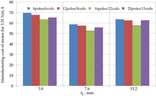 Due to the extensiveness of the study, only selected results of the calculations are included in the paper in the form of graphs. A comparison of material and labour costs of magnetic circuit variants characterised by a different number of poles for the three selected coil heights hc is shown in Figure 5. It can be seen from the graph that the lowest costs for a motor with a maximum torque of T = 3.51 Nm are obtained for a magnetic circuit with 16 poles and 12 coils at a coil height of hc = 7.6 mm. The results presented in the following part of the work concern only the selected motor structure with 16 poles/12 coils.