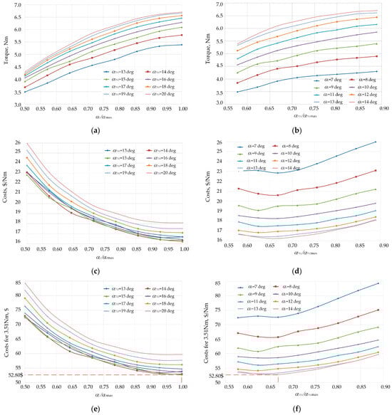 The calculated dependencies of the electromagnetic torque Torque on the αc/αcmax parameter determining the coil side span and on the αPM/αPMmax parameter describing the magnet pitch span are presented in Figure 6a and Figure 6b, respectively. In doing so, it was assumed that for αPM = const (Figure 6a), the side span varies from 7 to 14 every 1 deg, where αcmax = 14 deg. In contrast, in Figure 6b, the span of the αPM magnet varies from 13 to 20 every 1 deg, where αPMmax = 22.5 deg is equal to the polar pitch of the motor. Figure 6c,d summarise the dependence of the Costs parameter on the coefficients αc/αcmax and αPM/αPMmax, respectively. On the other hand, in Figure 6e,f, the dashed lines indicate the estimated motor costs for the industrial partner’s required maximum motor torque value of T = 3.51 Nm. In summary, based on the analysis of the calculation results, it was found that the lowest cost of materials and labour is $52.80, and the magnetic circuit with such manufacturing costs has the following dimensions: hc = 7.6 mm, hPM = 6 mm, h y1 = hy2 = 10 mm, αc = 14 deg, αPM = 15 deg. The calculations further show that the axial length of the magnetic circuit Li = 60 mm and the masses of copper, magnets and steel are 1.51 kg, 0.375 kg and 1.61 kg, respectively. The number of turns in the coil is equal to 62.