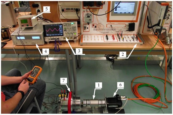 The test stand: 1—torque sensor, 2—drive control system, 3—oscilloscope, 4—programmable power supply, 5—measured interface of torque meter, 6—servo motor, 7—prototype motor.