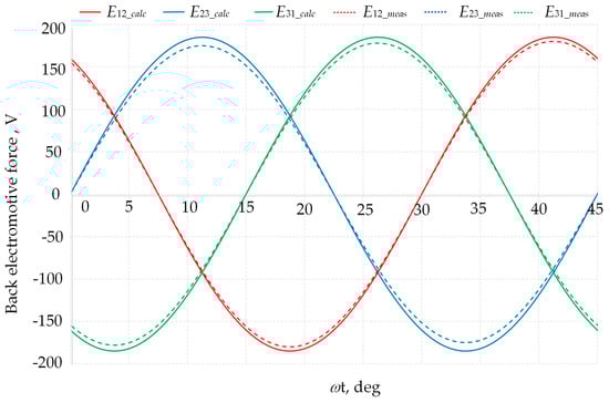 In the first stage of laboratory tests, selected values of the motor’s functional parameters, such as open-circuit induced voltages at the motor terminals (E12, E23, E31), as well as torque–angle characteristics, were measured and compared with results obtained during simulation tests. A comparison of the measured (meas) and calculated (calc) voltage waveforms for the rotor speed n = 2150 rpm is shown in Figure 10. On the contrary, Figure 11 shows a comparison of the calculated (calc) and measured (meas) characteristics of the electromagnetic torque as a function of the angular position for current values equal to 1.5, 3 and 4.5 A, respectively. It should be noted that, due to the lack of slots, there is no cogging torque in the motor.
