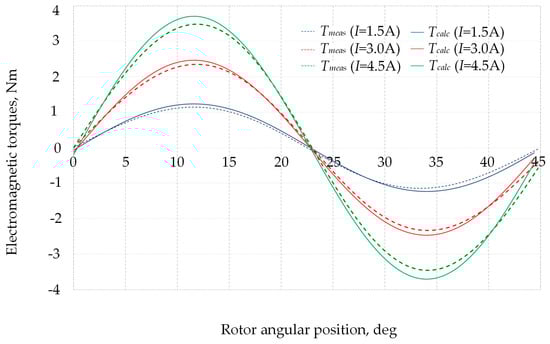 Comparison of the calculated and measured electromagnetic torque versus rotor angular position for different values of phase current.