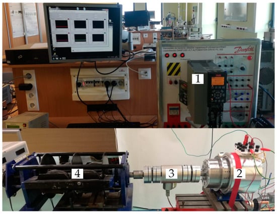 Test stand: 1—converter, 2—coreless motor, 3—torque and speed transducer, 4—eddy current brake.