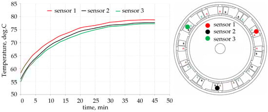 In the next stage of tests, selected motor thermal tests were carried out. First, the temperature course was determined at selected points on the motor during the machine heating test. These points are highlighted in colour on the motor cross-section shown in Figure 10. The temperature at these points was measured using resistance sensors PT 100 and a high-precision data acquisition system by National Instruments. The course of temperature rises in the motor under maximum load (3.51 Nm) are shown in Figure 13.