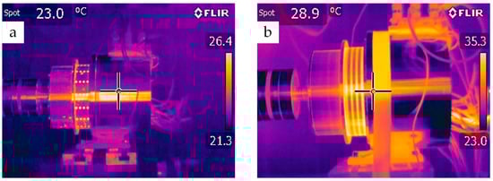 During the heating test, the surface temperature of the motor was also monitored using a FLIR T62101 thermal camera. The recorded temperature distributions obtained for a load torque value of Tmax = 3.51 Nm and a speed of 2150 rpm are shown in Figure 14a (t = 0) and Figure 14b (t = 42 min), respectively. For time t = 42 min, the temperature stabilised.