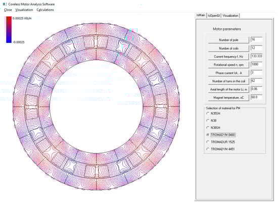 Simulation studies of the considered two-rotor motor design with die-cast rotor were carried out using in-house software developed in the Borland-Delphi environment [34]. The software developed allows the magnetic field distribution, electromagnetic torque waveforms or induced electromagnetic forces to be calculated, taking into account the set temperature of the magnets. The calculation results obtained in the in-house programme were verified with those obtained using the Maxwell-Ansys package. The discrepancy between the results did not exceed 4%. Figure 16 shows a view of the user interface of the in-house software.